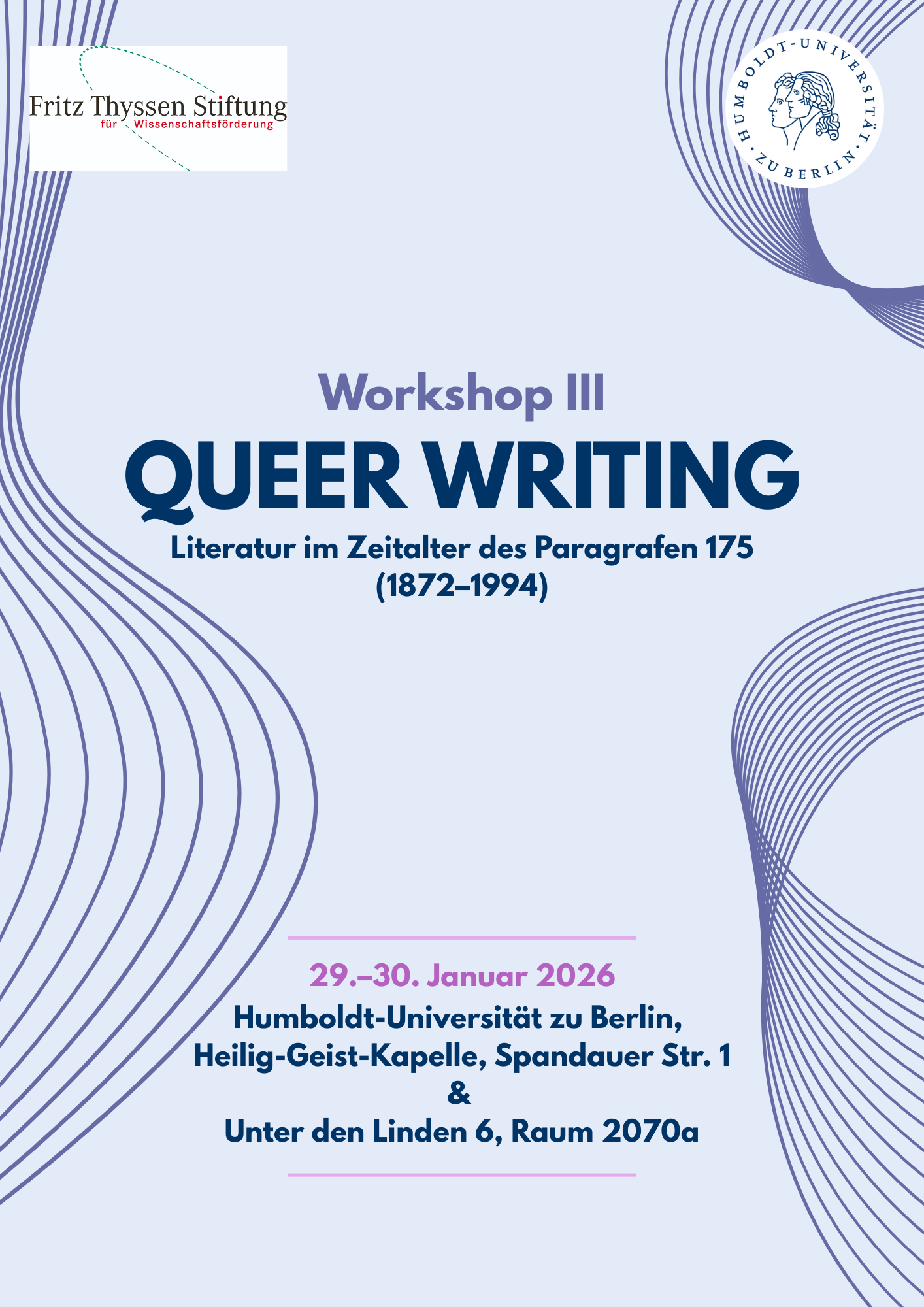 Vom 29. bis 30. Januar 2026 findet an der Humboldt-Universität zu Berlin der Abschlussworkshop Queer Writing. Literatur im Zeitalter des Paragrafen 175 (1872–1994) statt. Die interne Veranstaltung dient der Vorbereitung des Sammelbandes Queer Writing, der exemplarische queere Lektüren versammeln wird.